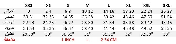لوحة مقاسات أوزون النسائي (جميع المقاسات بالانش):